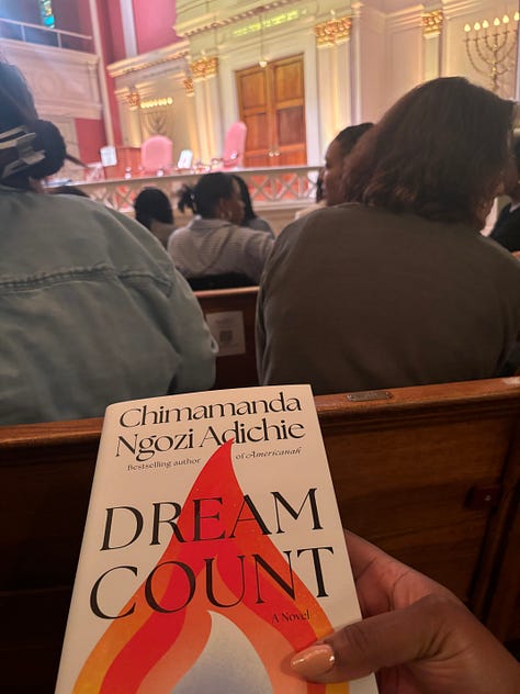 The day before things fell apart, I attended an author talk hosted by Politics & Prose for Chimamanda’s new book Dream Count which explores the interior lives of four African women with their loves, longings, and desires (tbh I’m still struggling to finish it). One of the main characters, Chiamaka, had a boyfriend Darnell who irritated my soul, and I wanted better for my girl. So I submitted this question at the event to ask Chimamanda about why the character Chiamaka was making questionable choices: